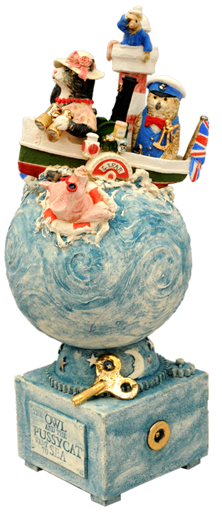 The Owl and the Pussycat with cogs Stoneware, T Material, with underglaze colours and gold and platinum lustres. Height 29 cms high